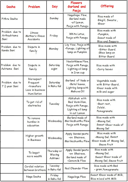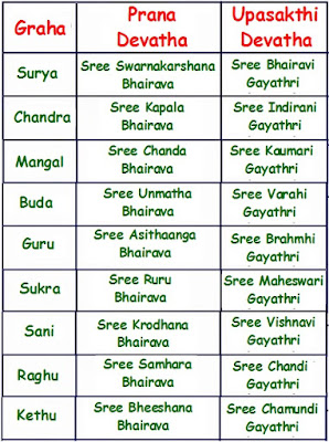 Each of the graha dosha’s are wiped out by God Bhairava’s grace if one pray him here particularly on Sundays by chanting particular Bhairava Gayathri Sloka which consists of separate mantras for Bhairava and Gayathri relevant to each of the graha. The Prana Devatha and Upasakthi Devatha to be prayed are indicated below.
